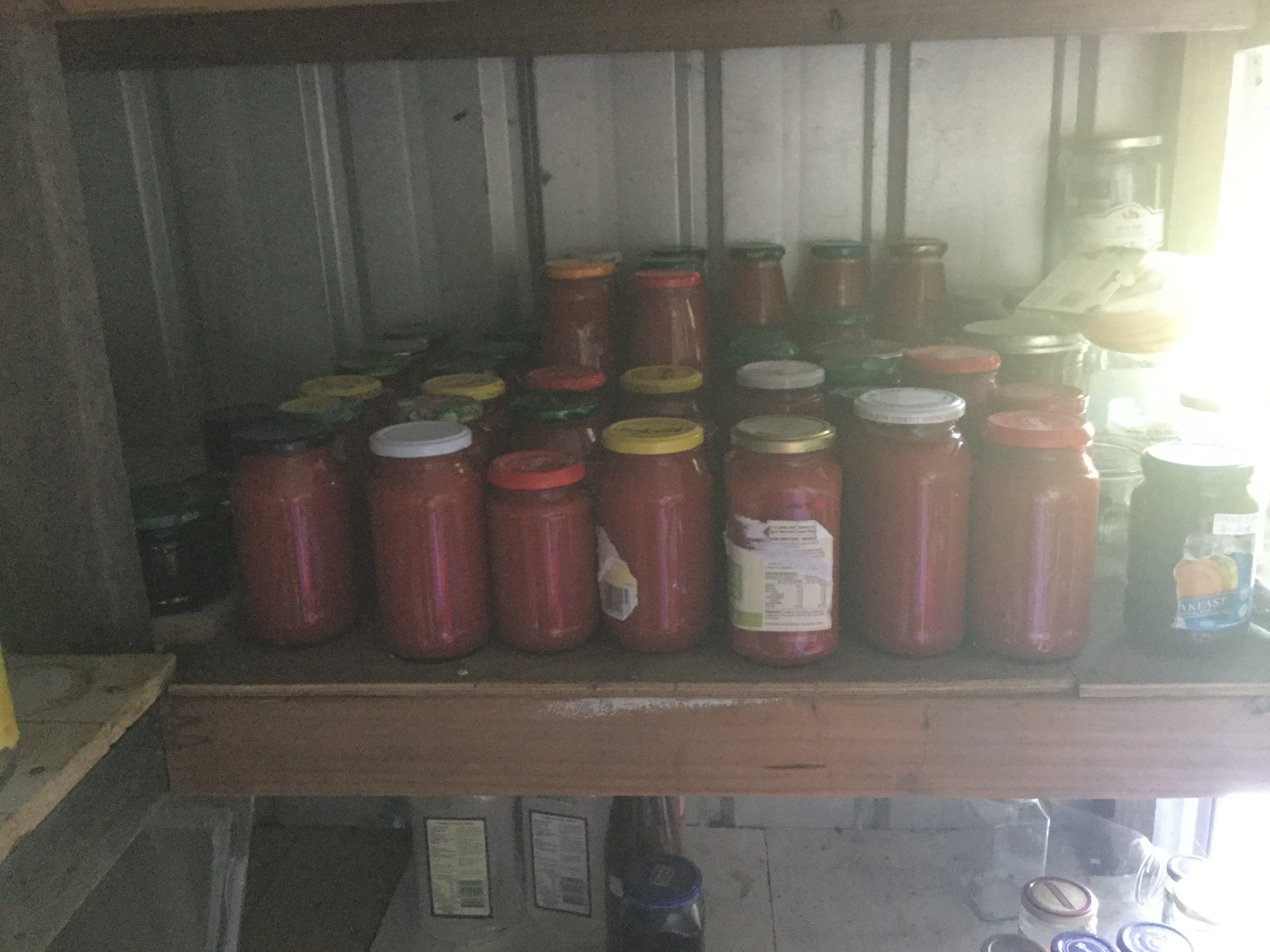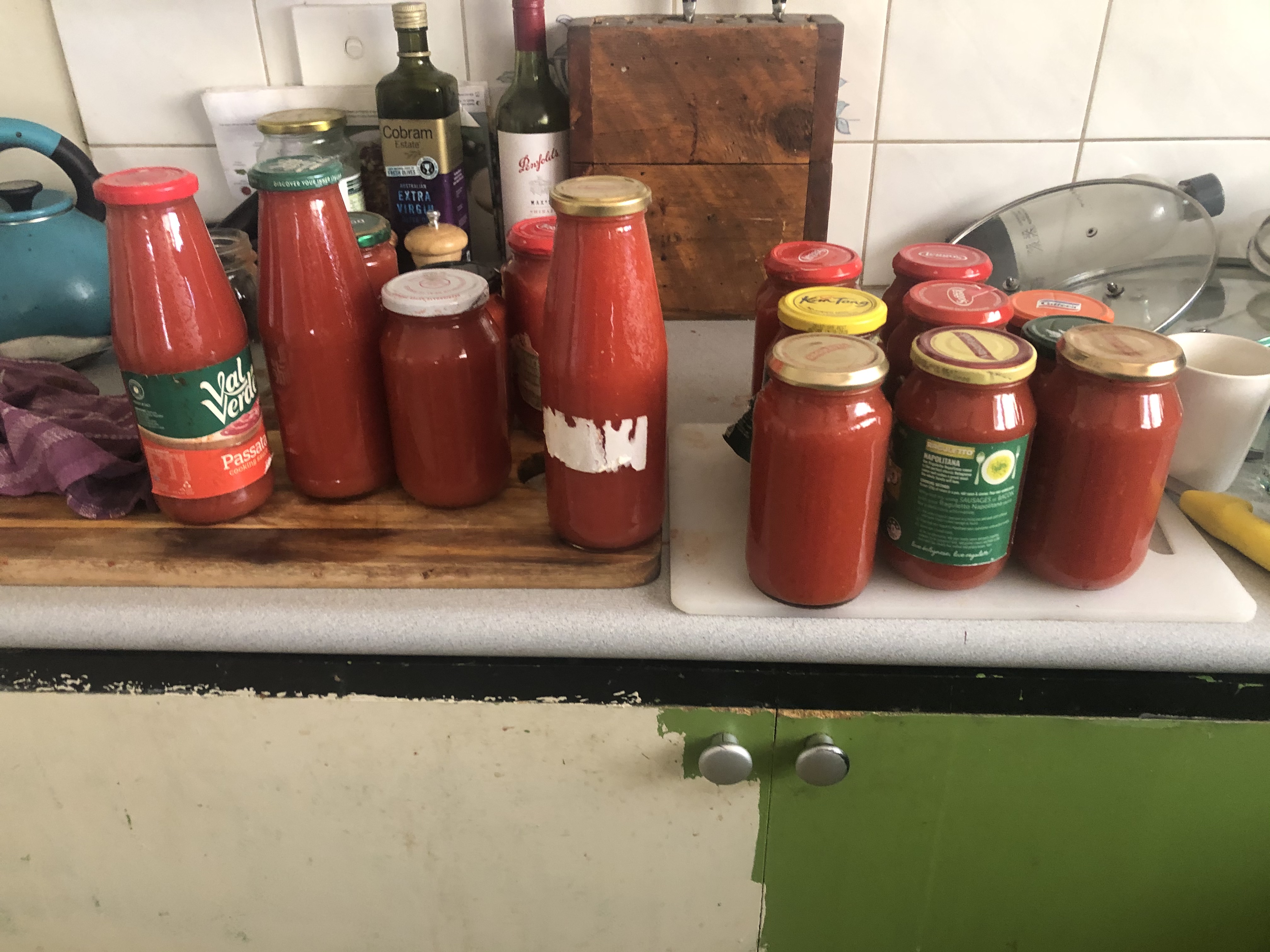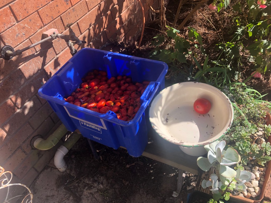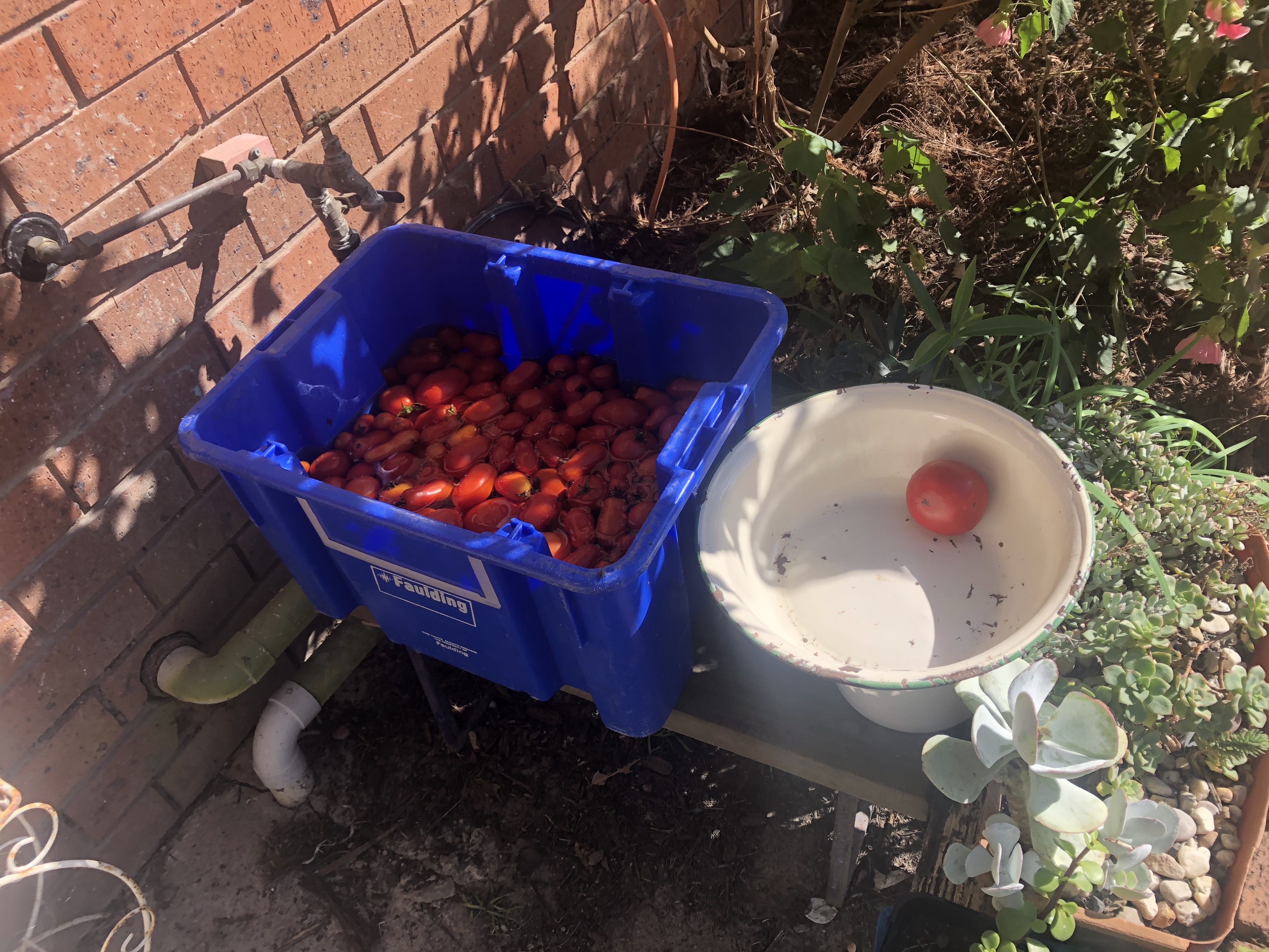 Its early Feb and we haven’t had a real hot summer, tomatoes are just starting to come on, I have 2 dozen plants and am picking a bucket per day- not red, I pick them orange then ripen in my special kitchen shed. Tomato’s need the dark to turn red, I have a long bench in there thats like a conveyer belt, Each day I pick, I move them all along and every Friday night is spent making Passata.