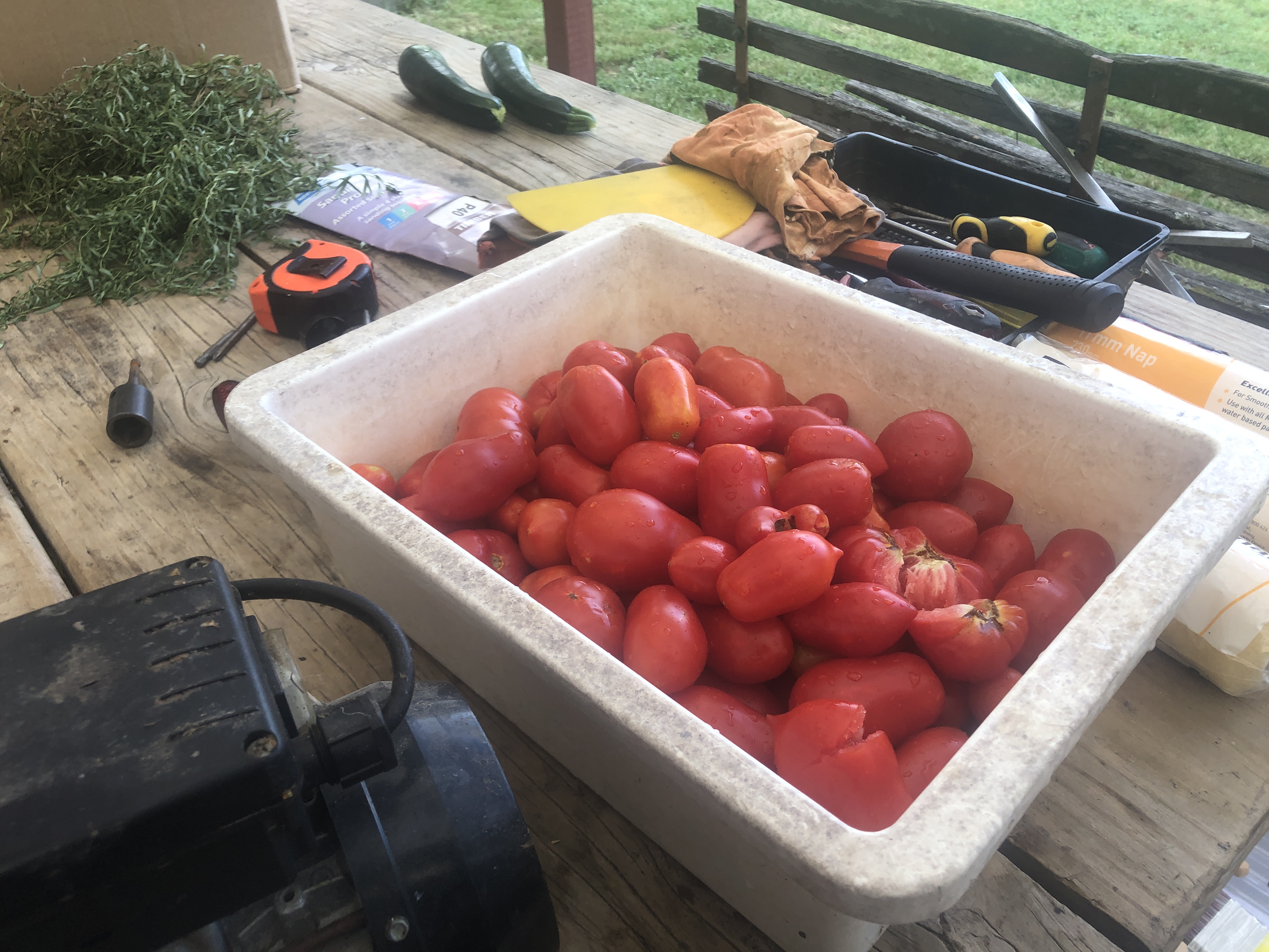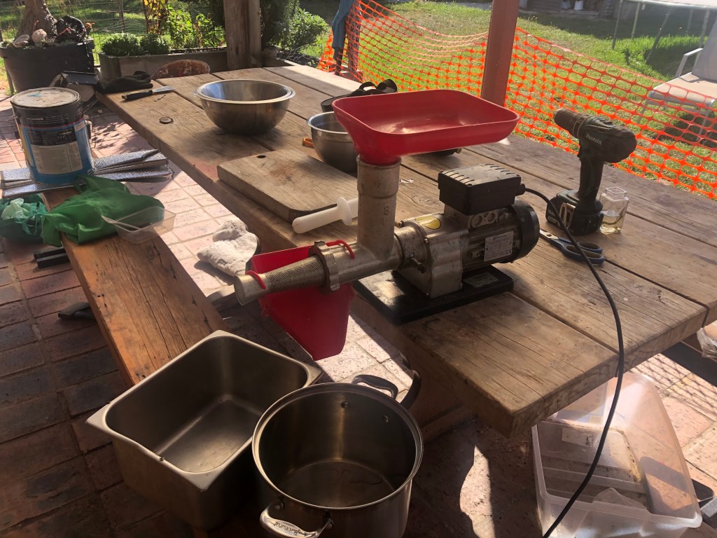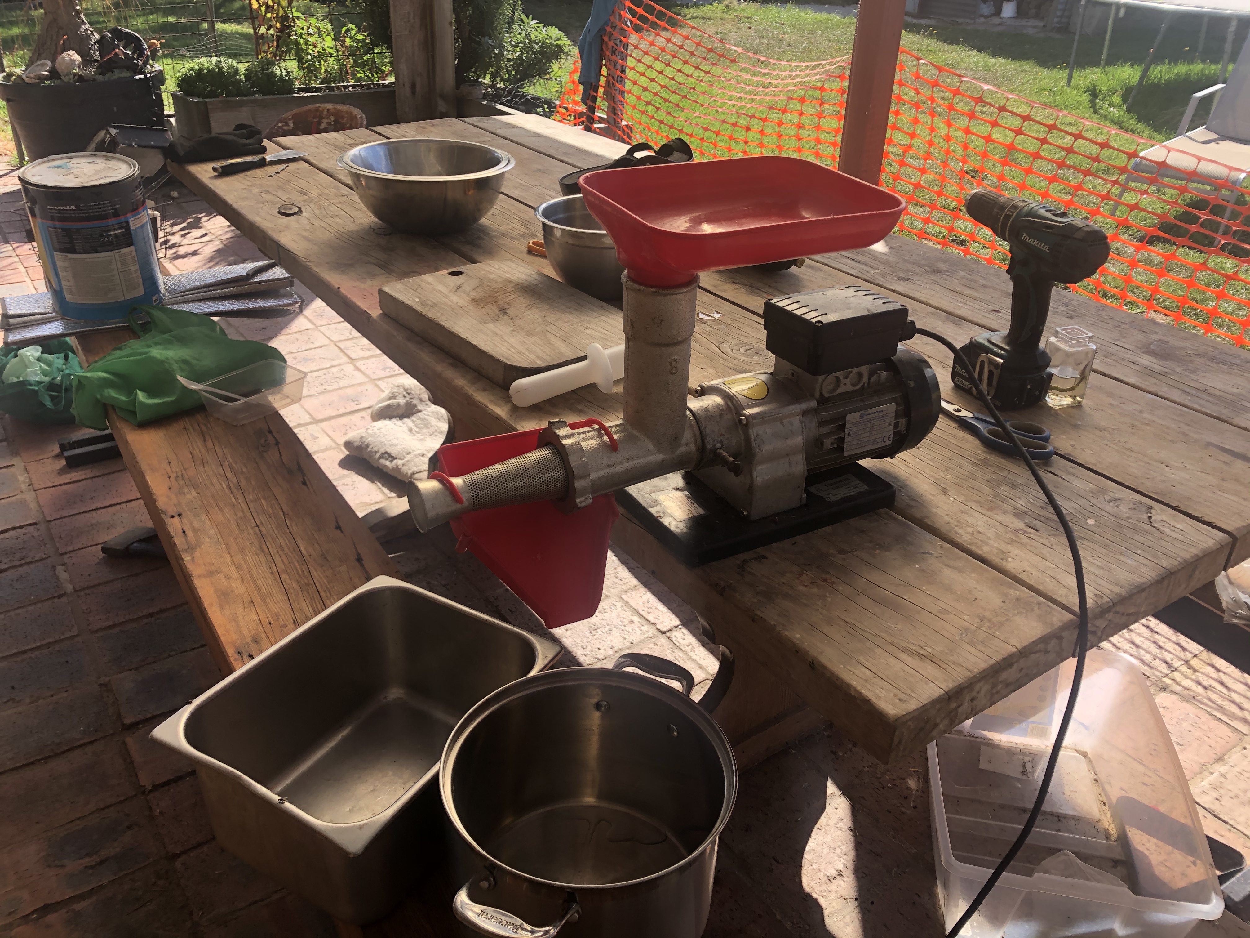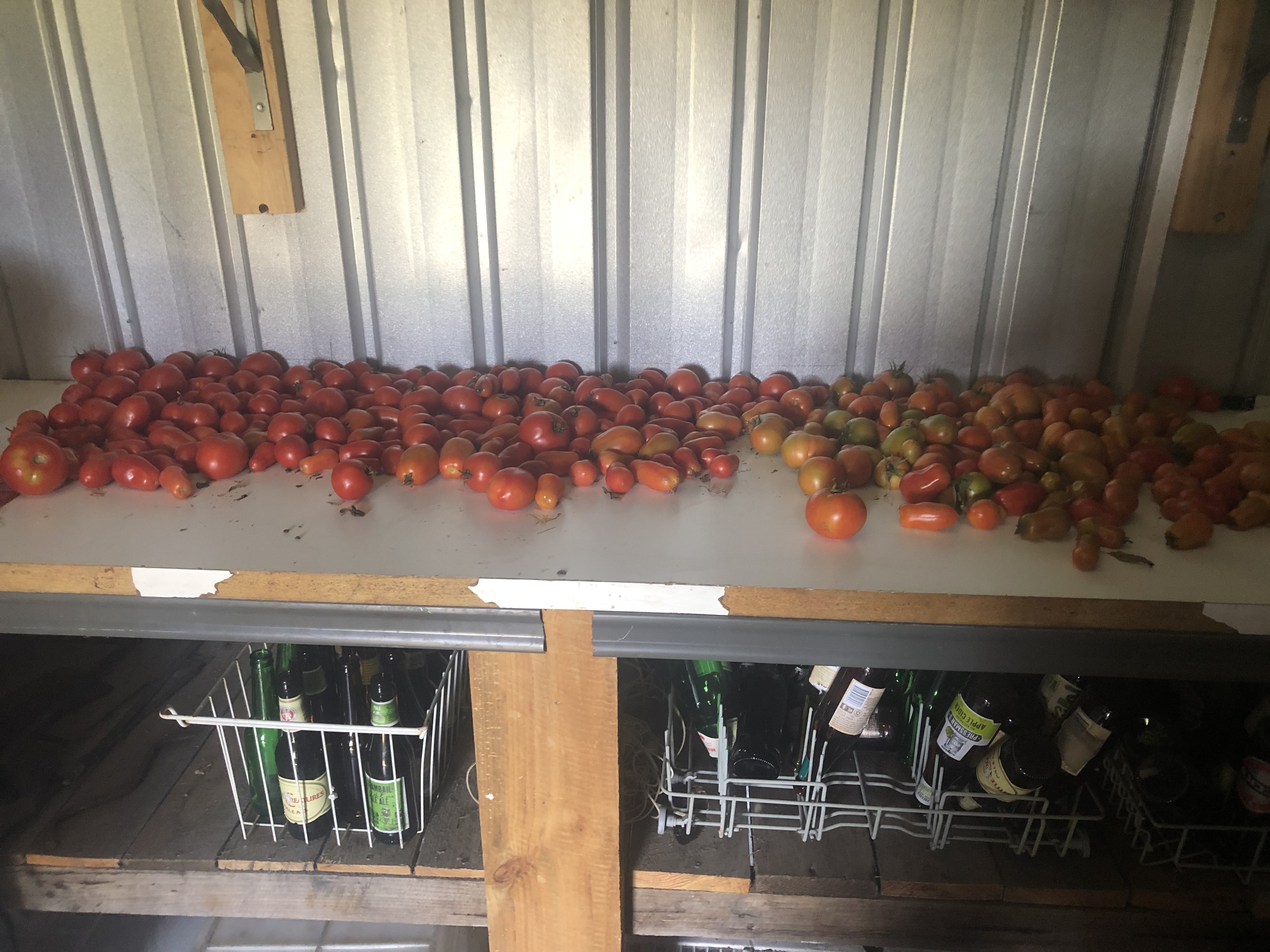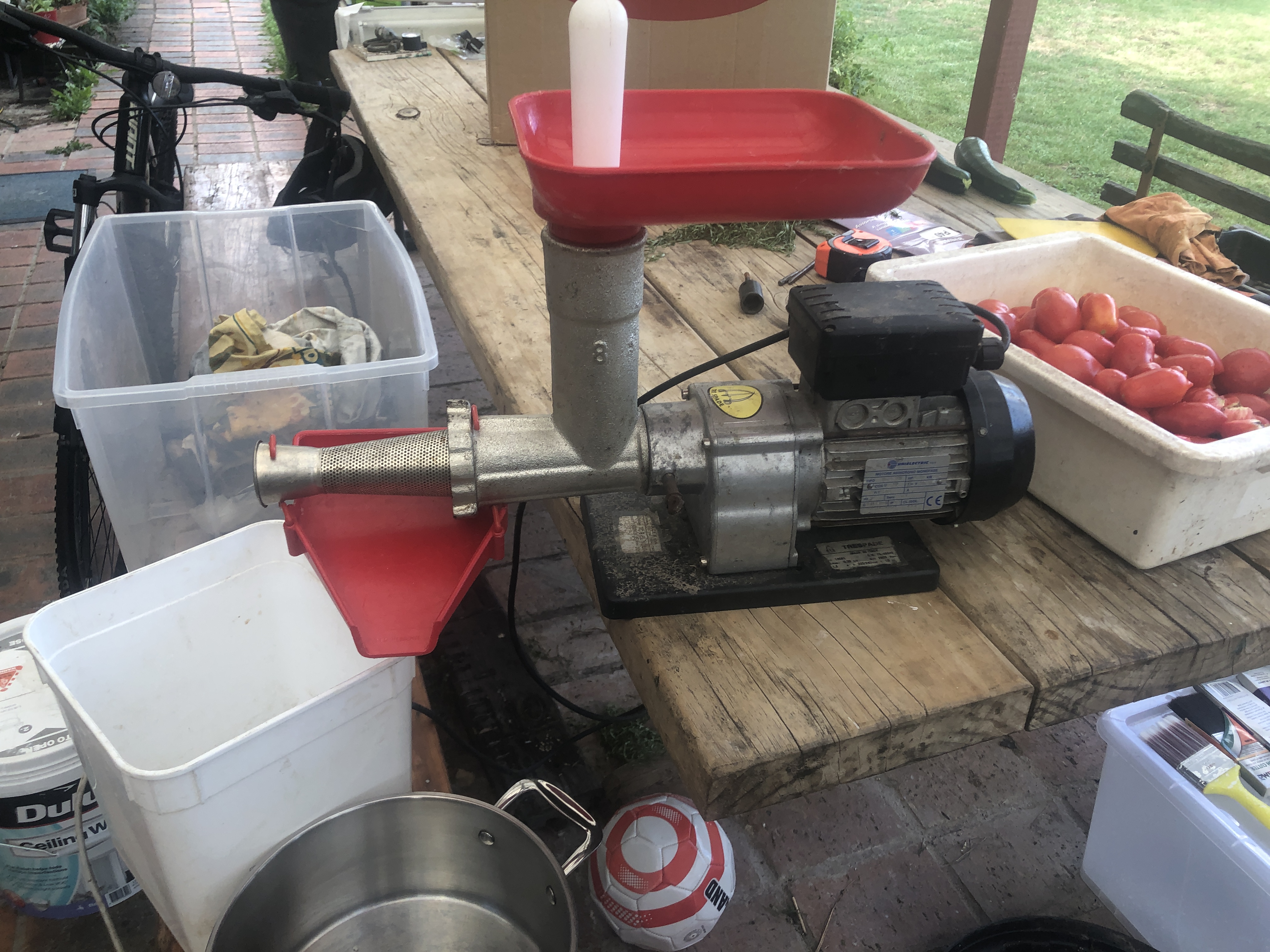 Its early Feb and we haven’t had a real hot summer, tomatoes are just starting to come on, I have 2 dozen plants and am picking a bucket per day- not red, I pick them orange then ripen in my special kitchen shed. Tomato’s need the dark to turn red, I have a long bench in there thats like a conveyer belt, Each day I pick, I move them all along and every Friday night is spent making Passata.
