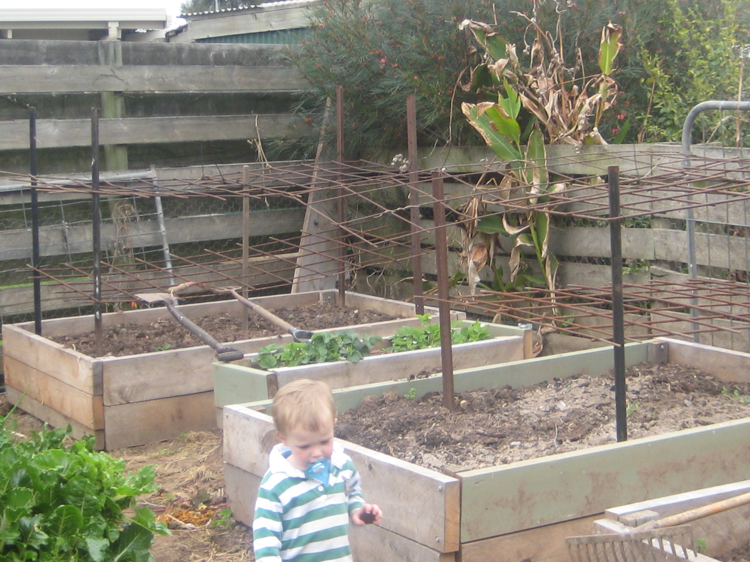 Mason just checking that my tomato frame is ok. Love reinforcing mesh in the veggie garden, seems like an odd pair, but a true veggie garden is built with love and lots of leftover bits. Reo is great for Scythian that climbs and great for tomato frames, I use 2 layers, so I don’t have to stake the bushes- its either through sheer laziness or intelligence, probably the first option. It works great- my mate form Ballarat shown me this artform.