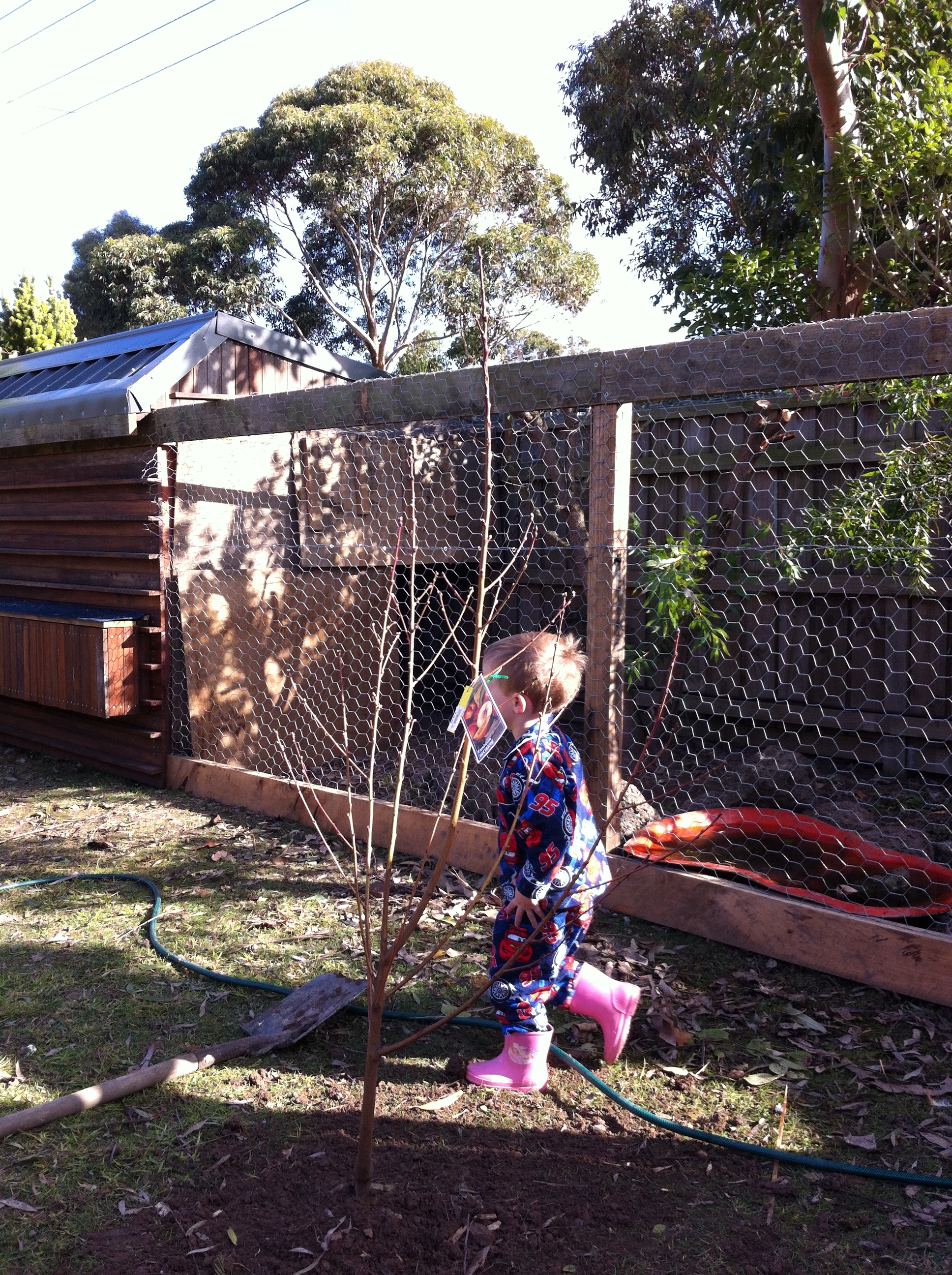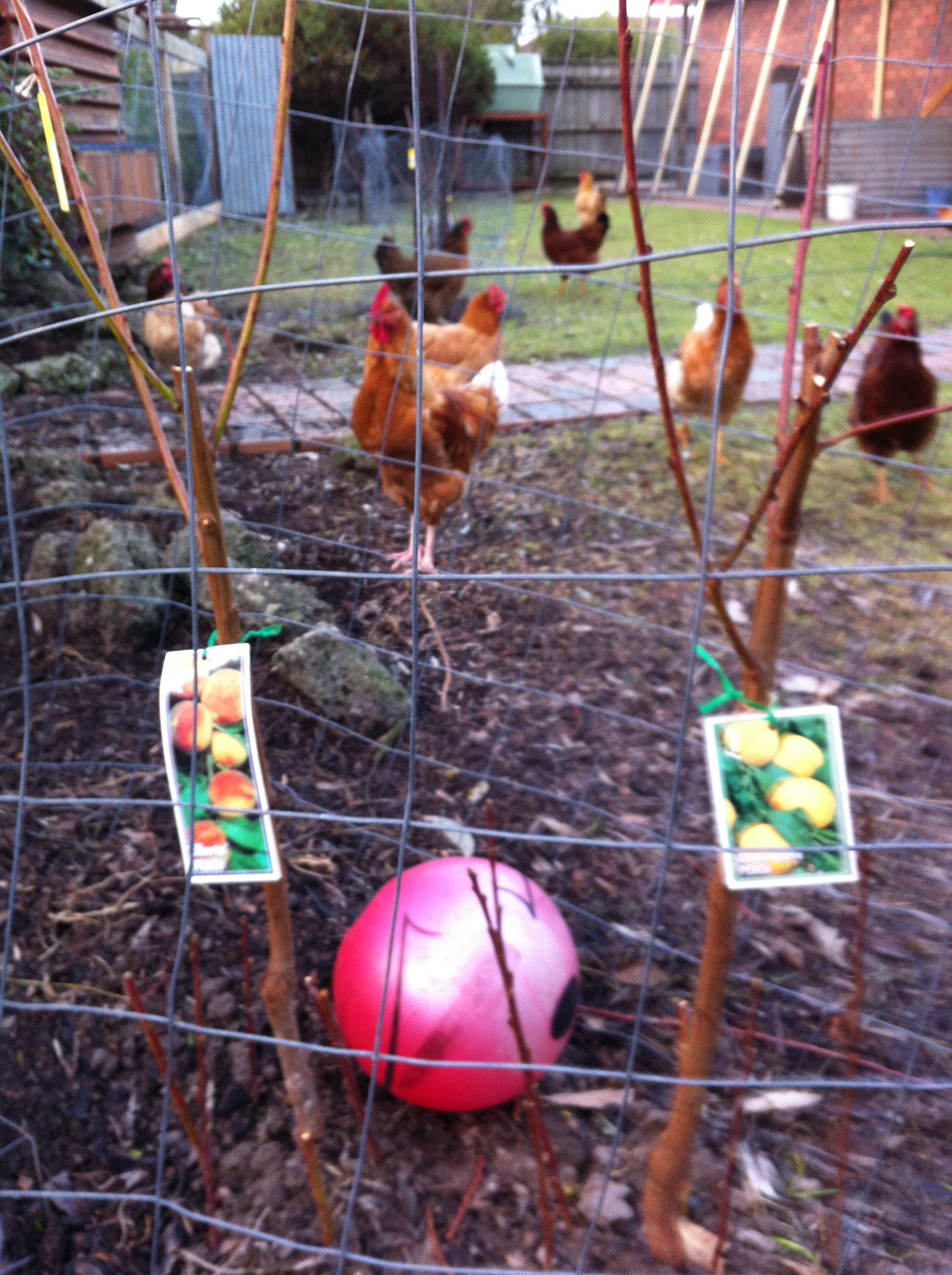 Below is generally what happens, you pay good money for a fruit tree then chop it in half- start the shaping process, this is integral if you wish to have a well shaped tree that will give fruit for all its life. Chooks have settled in and are doing their part of turning over the soil. Worms are much happier in their new compost pit. This for me is not about producing compost but about keeping all or the majority of rubbish or waste on my own property. Its a waste product is does not need another crack at producing carbon pollution just to get it to the local rubbish dump. Its valuable organic material and I can keep all the nutrients to feed my fruit trees later. I view my property as a closed loop, when I take food from the property I am exporting nutrients and goodness, so all waste/leftover/cuttings anything organic can play a role here and build other plants, animals or soils.