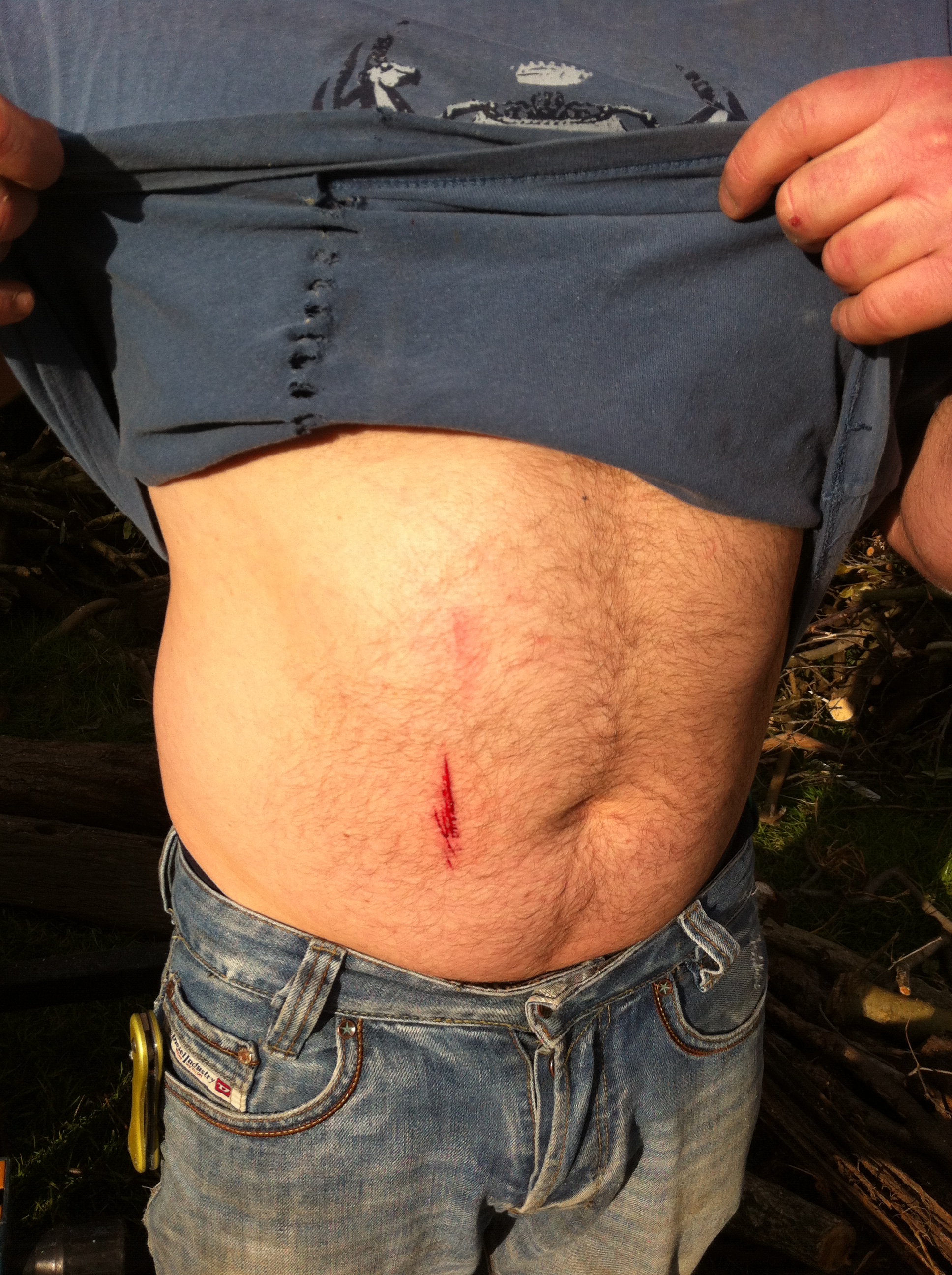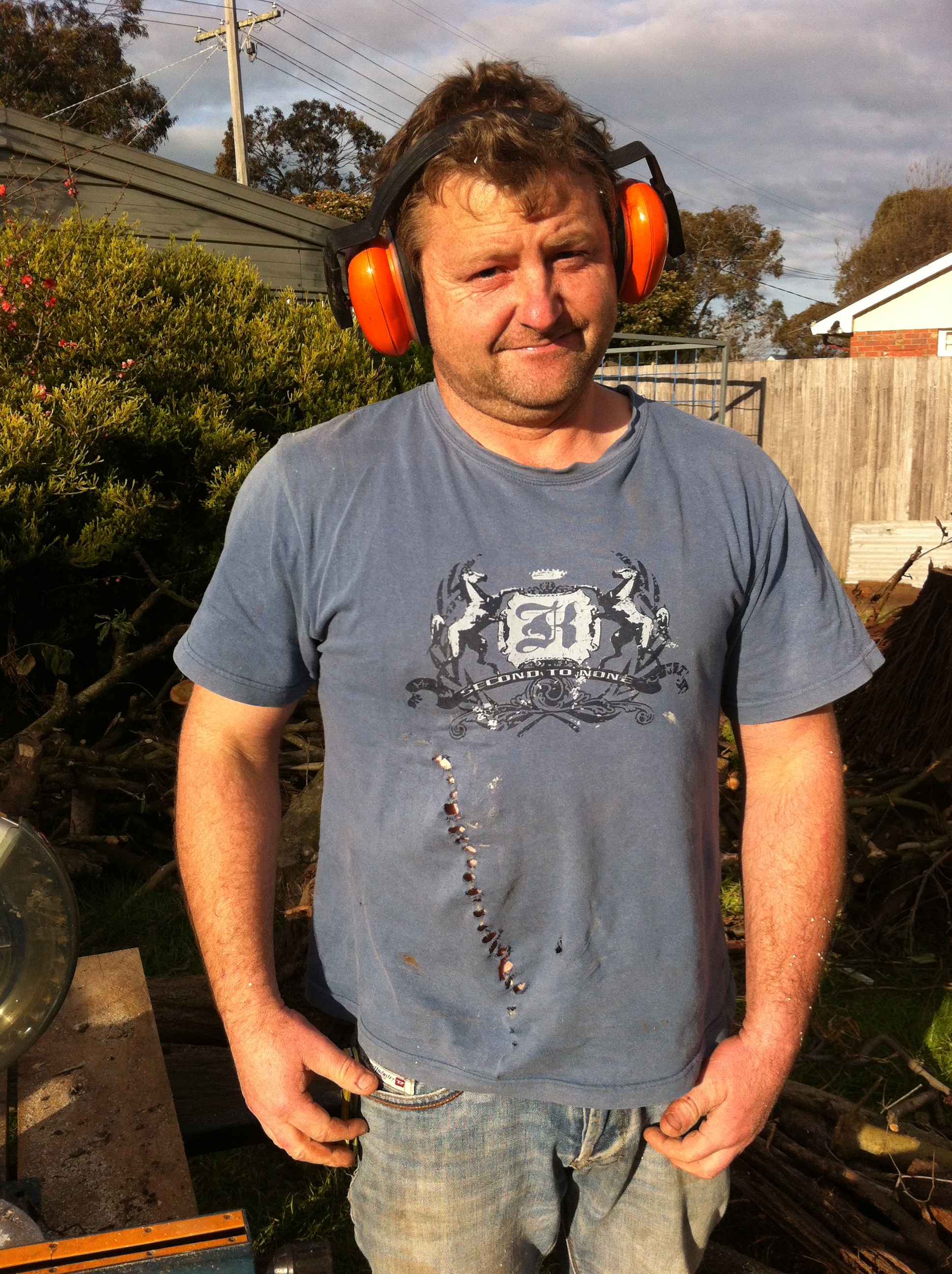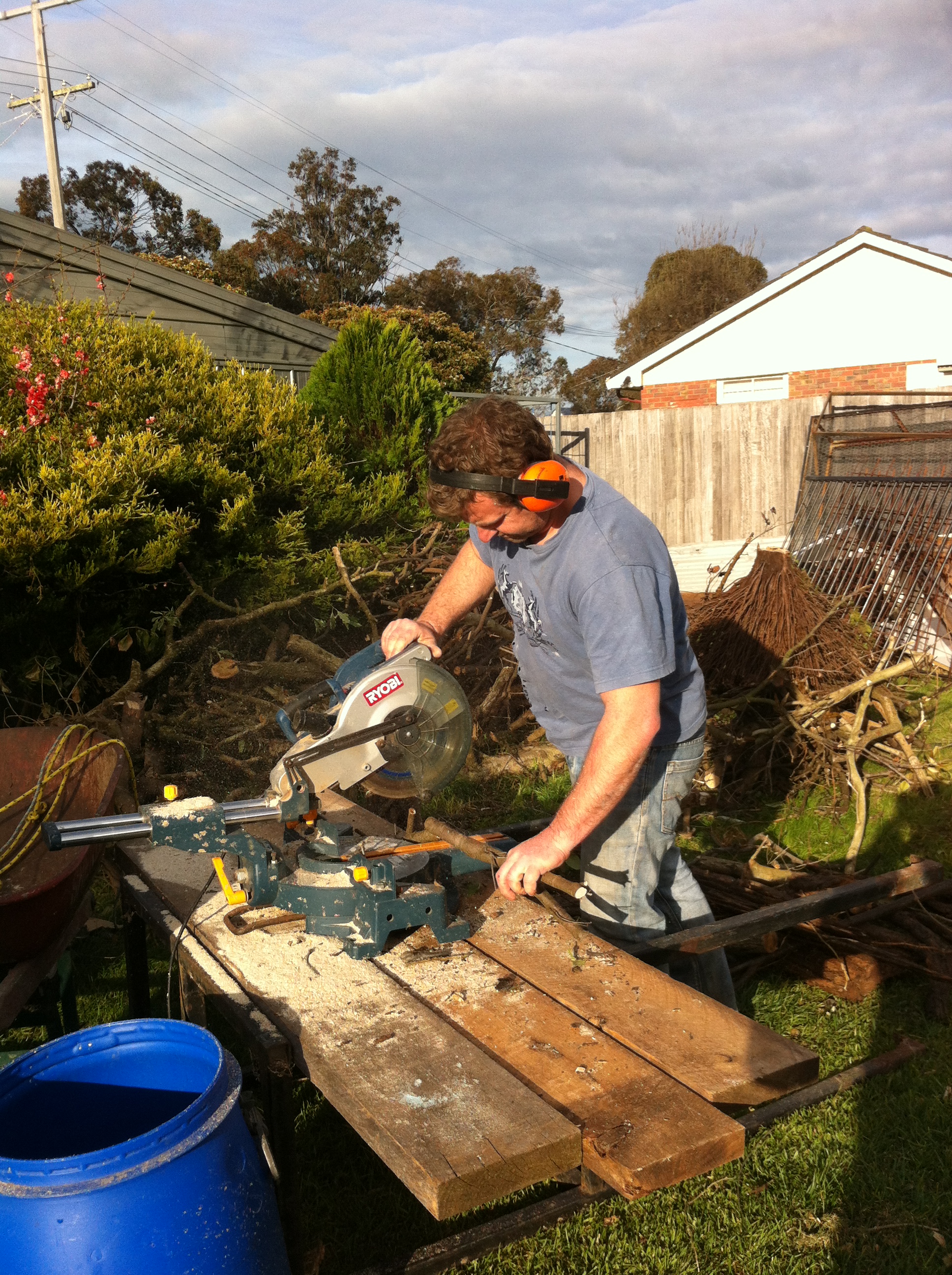 This is for all the people that donate bits of themselves to the cause, mostly some skin and pride. Obviously things can get real ugly but for the most part, I have survived till the age of forty with all in tact- even battered through 12 years as a Butcher. Now this appeared like a good idea at the time. Hmmm lots of branches left over from removing trees on the new property, chainsaw still blunt- to sharpen or not to sharpen, what other tools do I have you ask?. Well I have my drop saw, that could cut this up, its sharp and powerful. dangerous- not to date!!!!!