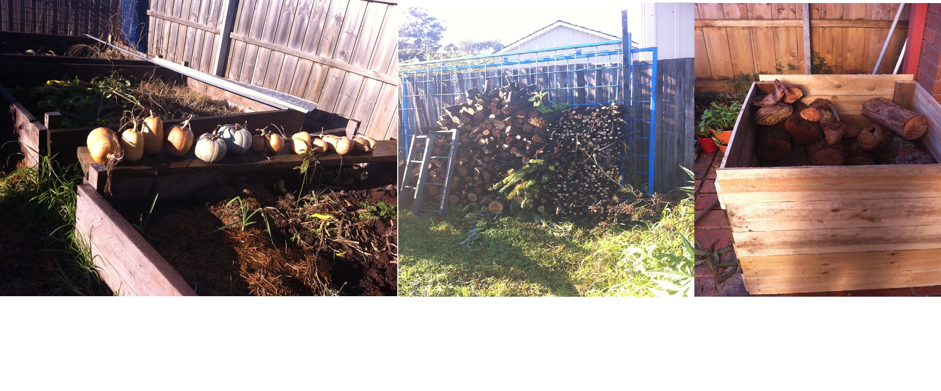 Some butternut pumpkins- The wood in the middle is from a tree that I cut down to make way for a carport- yep not a great plan but I will be planting a lot more trees- it was not native anyway but I am not wasting the wood and have cut it all up to eventually go into the heater- we cant afford to waste anything. The Wood box at the back door is all made from wood that the neighbour did not want so I put it to good use- sometimes people want things to look the best and will go out and buy new wood instead of using what we have first- its not about the money- its using a tree that is already cut down before purchasing more wood.