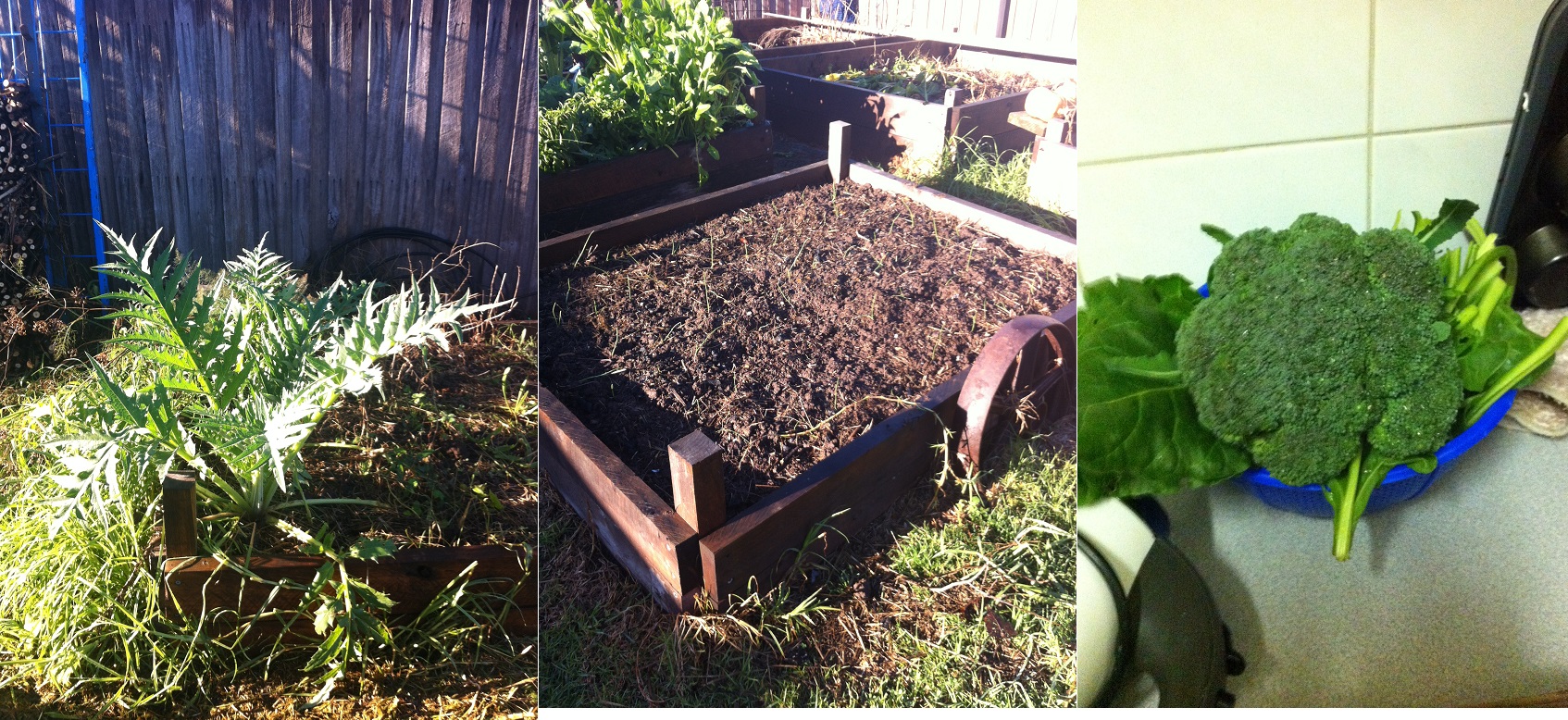 Artichoke thistle, onions and the first broccoli of the season. Now is the time to plant onions and your garlic should be trying to sprout- just stick it in the ground and it will grow- unless its from a supermarket where its been sprayed with growth inhibitors.