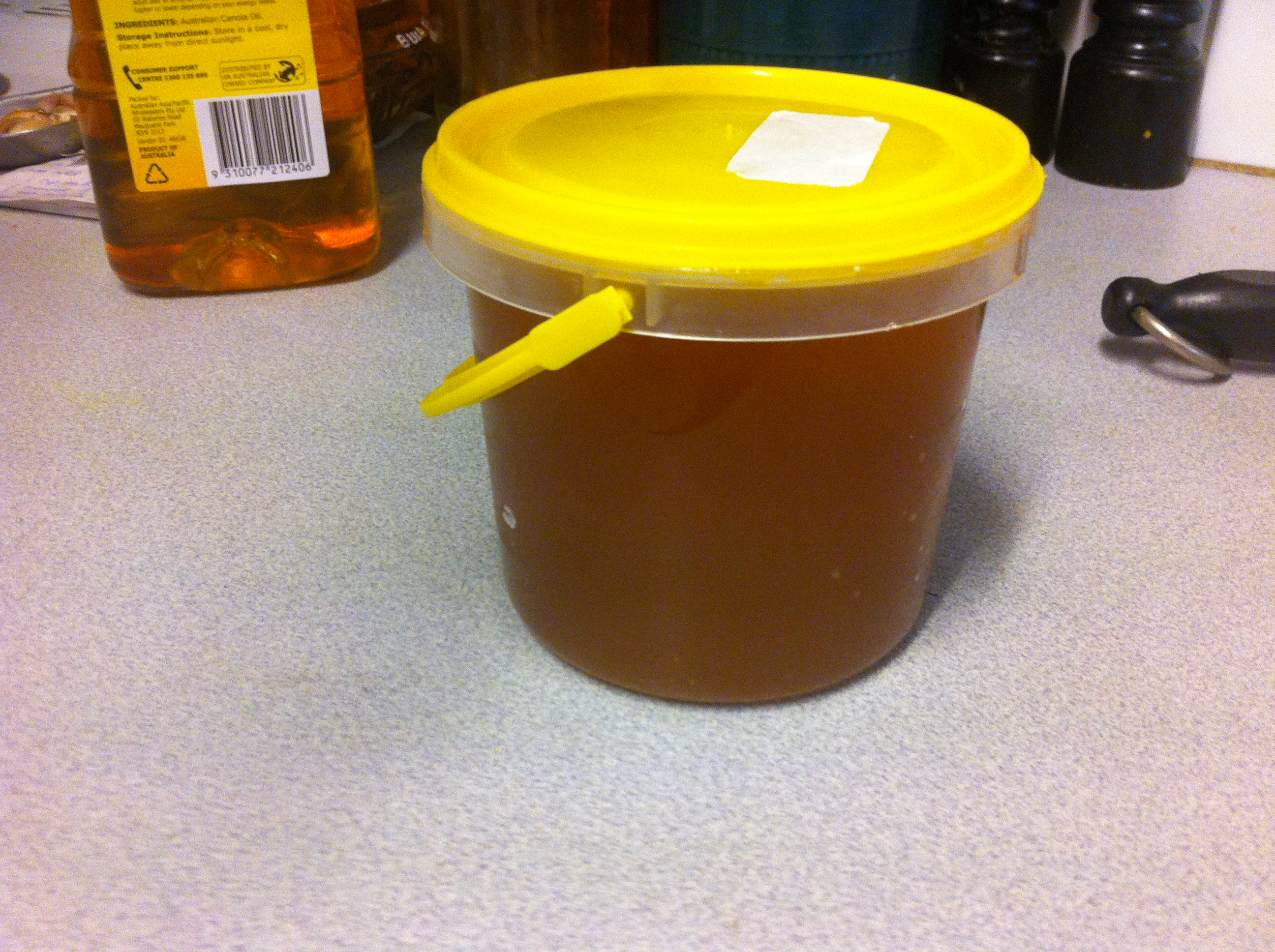 honey- hmm from a friend that lives just down the road- talk about sustainable- Bees busy improving the neighbourhood fruit & Veg supply and for their efforts, we steal their honey. I swapped for some meat that I acquired through my butchering skills.