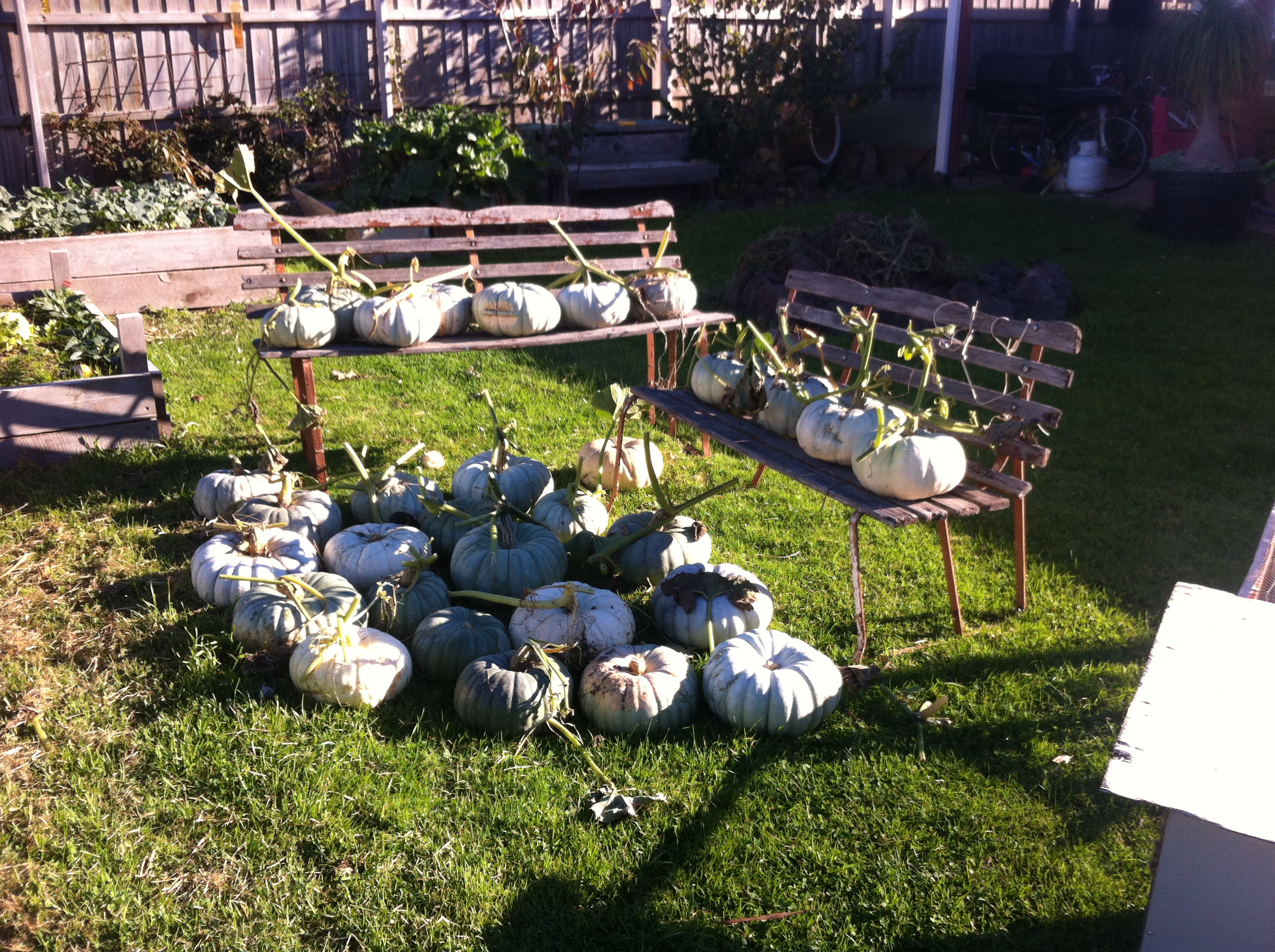 I ended up with 30 odd pumpkins, already started giving some away- that what food is for to bond relationships and grow new ones. Food is the gift of life and people even today recognise this. I have store some on a roof and some in the wood shed- I have read so much stuff all contradicting each other, so to hedge my bets- some inside and some outside.